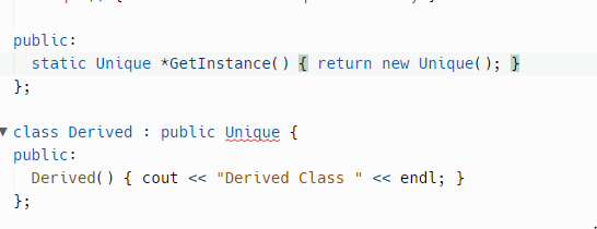 #include <iostream> using namespace std; class Unique { private: Unique() { cout << "final Unique" << endl; } public: // 객체를 반환하는 함수 static Unique *GetInstance() { return new Unique(); } }; class Derived : public Unique { public: Derived() { cout << "Derived Class " << endl; } }; int main() { Unique* u = Unique::GetInstance(); delete u; Derived d; }