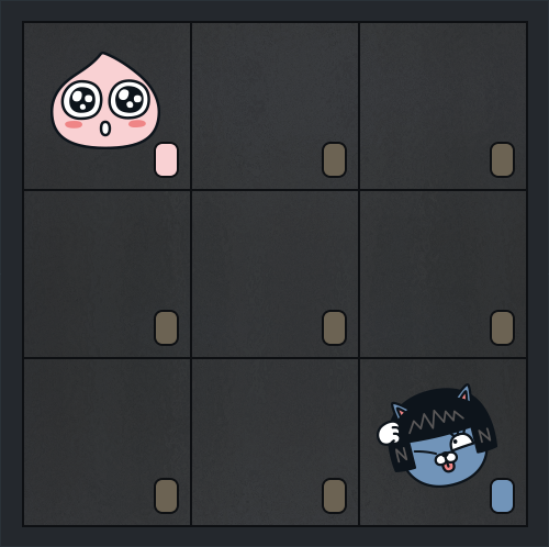 그것은 옷을 갈아입는데 다른 사람과 너무 가까워서 옷을 갈아입기가 불편하다는 것이었다.불만을 해결하기 위해 고민하던 라이언은 손님들의 예약시간을 참고해서 되도록이면 서로 멀리 떨어지도록 키를 나눠주기로 마음먹었다. 예를 들어, 락커들이 3x3 정사각형 모양으로 배치되어있고, 동시간대에 2명의 손님이 예약되어있다면 아래와 같이 락커를 할당하는 것을 고려해볼 수 있다.
