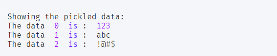 import pickle # 파일을 읽을 시, open mode 에 'read' 그리고 'binary_mode' 를 사용하여 'rb'로 읽어준다. file = open('important', 'rb') # pickle 모듈을 사용해 file을 로딩한다. data = pickle.load(file) # 파일을 닫고, data에 원하는 변수들이 저장되어 있을 것이다. file.close() print('Showing the pickled data:') cnt = 0 for item in data: print('The data ', cnt, ' is : ', item) cnt += 1실행 결과