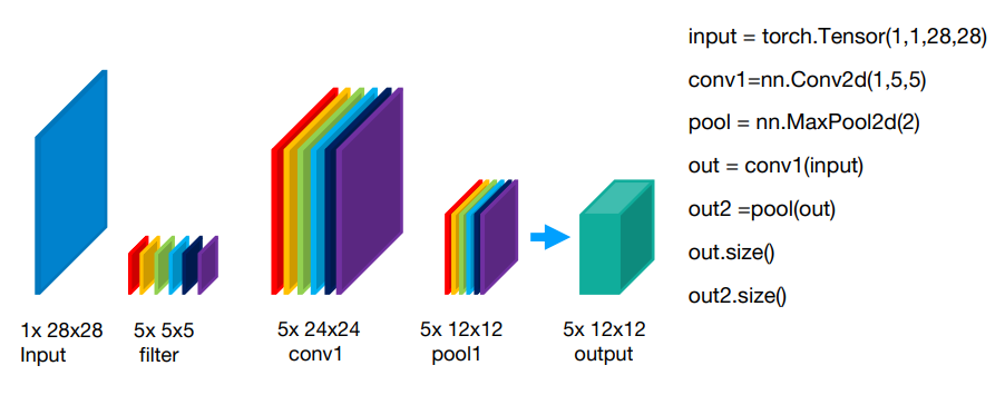 - 따라서 다음과 같은 5*5*5 의 필터를 적용한다 하는데 , 이는 정확히 (1*5*5)의 필터를 가진 Conv2d를 5개 사용해서 5*24*24 를 만들겟다는 것이다. (맨처음에 1개층 밖에 없는데 필터 5개를 어떻게 한꺼번에 적용하겠는가!!)