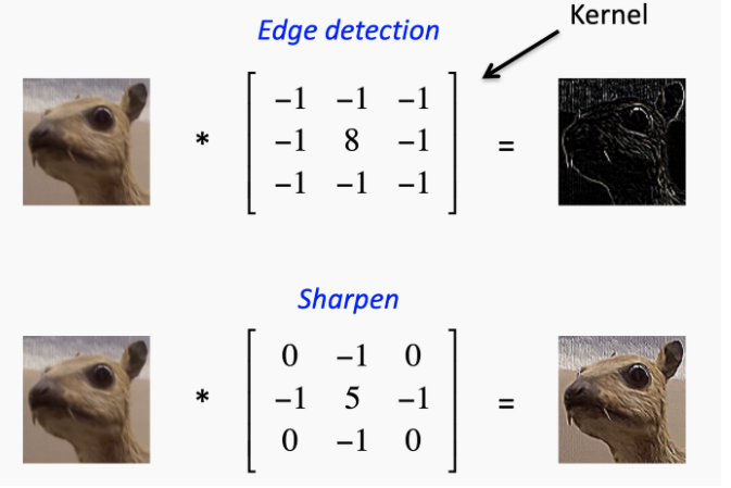 - 이 그림에서 보듯이 edge detection 을 하는 conv 를 적용했을 때는 우측 상단의 이미지, 그리고 좀 더 샤프한 이미지를 얻는 conv layer 을 적용시켰더니 좌측값과 같은 이미지 특성이 나오는 것을 확인 할 수 있다.