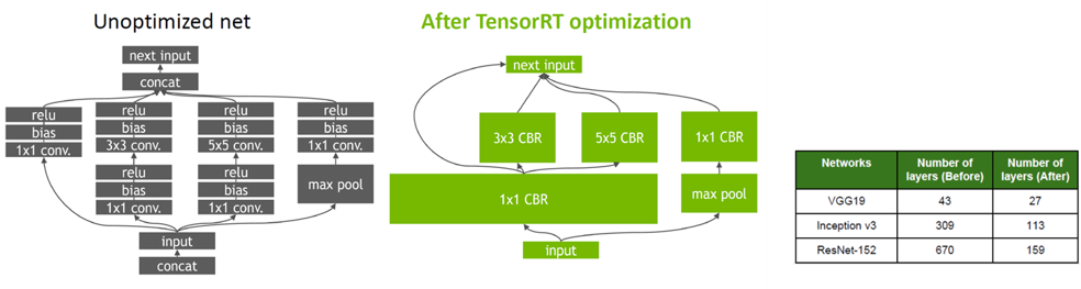 TENSOR RT 란 양자화 및 컬리브레이션, 그래프 최적화, 커널 자동 튜닝 등등의 기법으로 모델을 GPU 상에서 추론속도를 증가시켜주는 역활을 합니다. 밑은 가장 간단한 예시인데, 밑의 예시는 구글의 LENET 모델의 Inception module 을 virtical optimization을 시켜줌으로써, 최적화 시켜주는 가장 간단한 예시입니다. Tensor RT 로 된 수많은 자료가 있지만, 본 포스팅은 TENSOR RT 를 통한 최적화 방법에 대해 집중적으로 다룰 수 있도록 하겠습니다.
