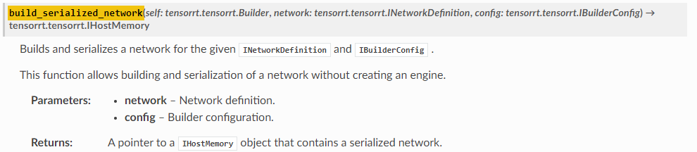 공식문서에서의 build _ serialized _ network 이렇게 builder.build_serialized_network 를 집어 넣주어, serialized network를 생성해줍니다. (복잡합니다.. 직관적이지 않지만 어쩔수 없습니다,,, C++ API 를 Wrapper 형태로만 감싼것이다 보니 약간은 어색할 수 있습니다.)
